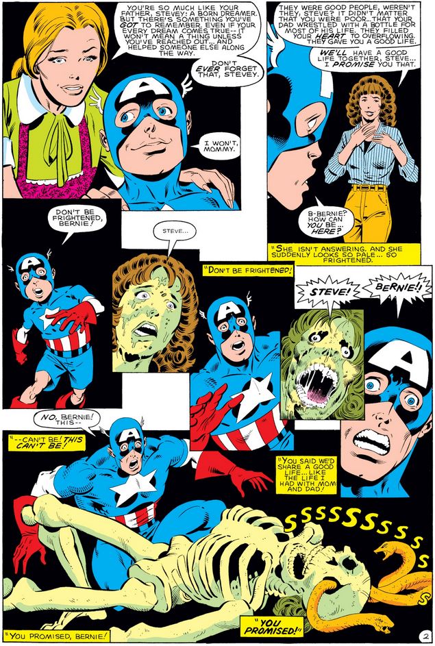 Like the last issue, this one opens in Cap’s dreamworld, where little Steve enjoys a meal with his parents, now long deceased…