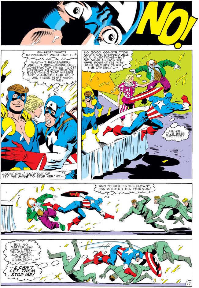Shocked into lucidity—aided by Constrictor’s earlier actions—Cap springs into action, his resolve unaffected by the medications.