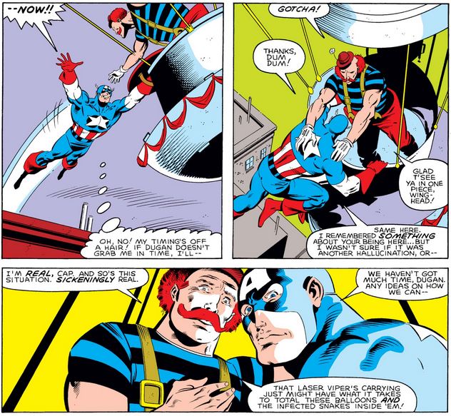 Cap looks skyward to the balloons carrying the deadly virus… in the form of snake venom, no less… to be delivered by snakes, of course. (Subtle, Viper is not.) Note how he starts to creep toward self-doubt and fatalism, only to catch himself and realize it’s just the drugs talking.