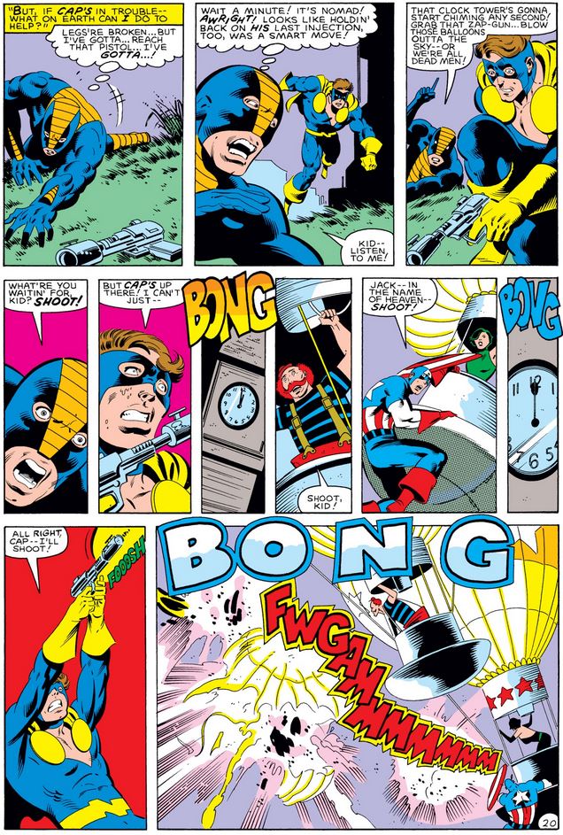 Let me change that: It’s up to Constrictor and Nomad to save the day. (Another point to the bad guy, who withheld drugs from both heroes.) Jack’s hesitant, of course, but after both Cap and Dum-Dum implore him to shoot, he shoots.