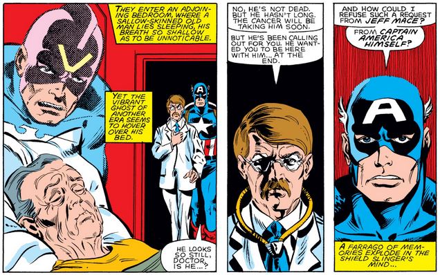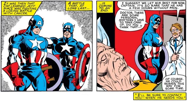 As we know from the last issue, Cap is not racing to fight the Red Skull, but to get to the bedside of an old friend and colleague, Jeff Mace, in the final days of his battle with cancer.