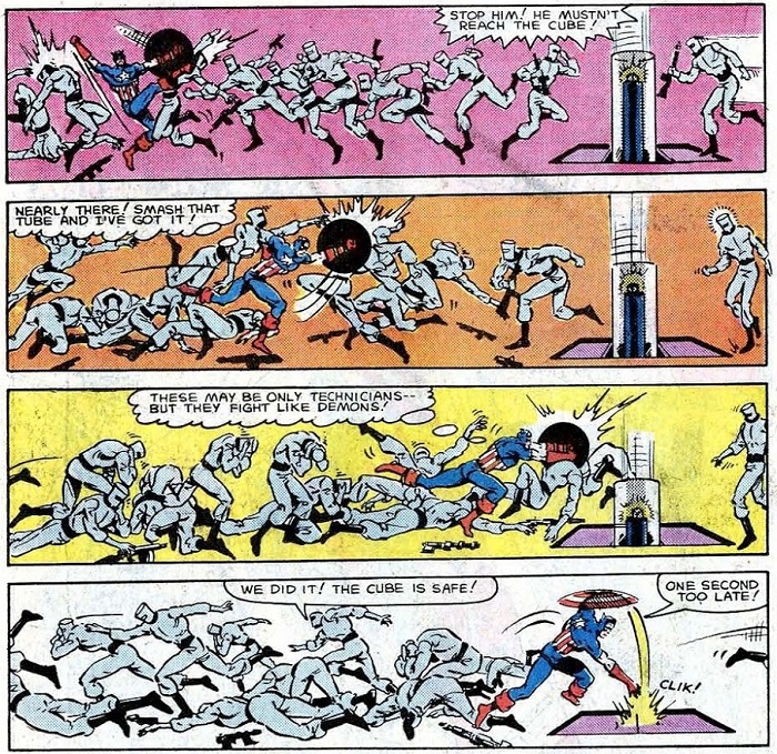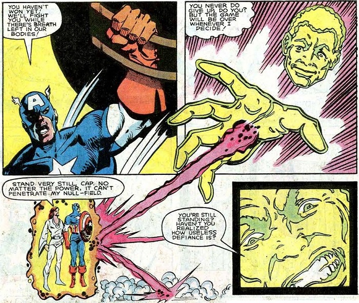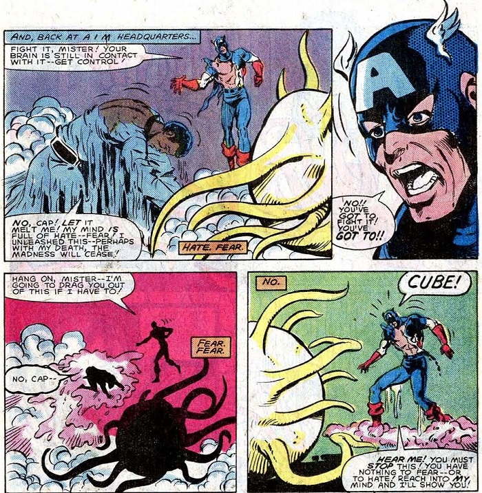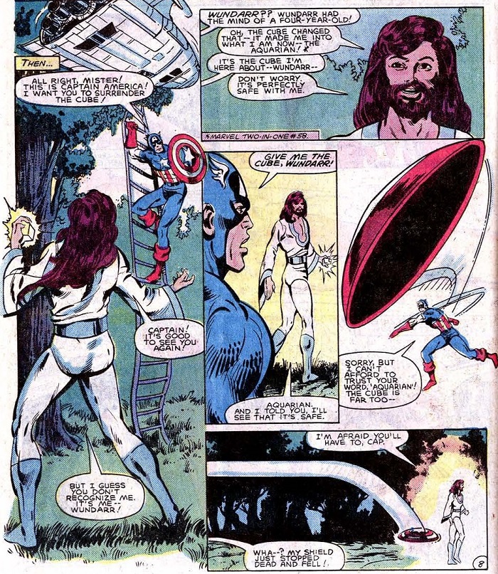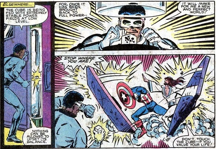 Realizing Aquarian and his power nullification… umm, power… is the more serious threat, Worrell uses the Cube to send him to the mountains of Tibet, hoping to make Cap give up. (Right.)