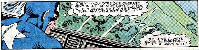 Cap and Aquarian do battle with the Cube-powered Worrell until the latter finally succeeds in using it to reshape the world as he sees fits, rendering him a god, yet Cap remains defiant.