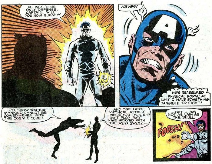 As Cap continues to recover, he taunts Worrell, a bold strategy (to say the least) when someone is holding the Cosmic Cube…