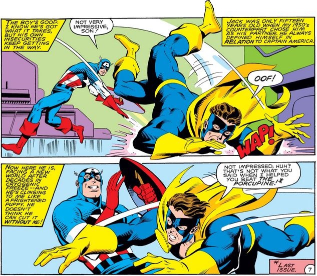 As the same time, Cap considers Jack’s unique position, in which he needs to break out of the “sidekick” role. (I know a fella in Blüdhaven he could talk to about that.) Also… is Cap’s back OK after that twist in the first panel below? Ouch.