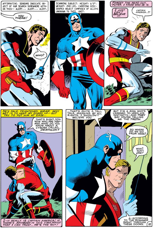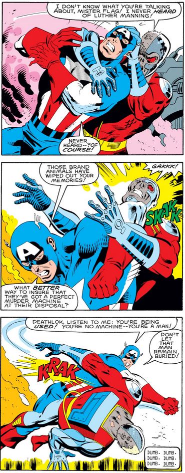 Below, Godwulf and Cap try to convince Deathlok to be a leader, and Cap once again sees a bit of his own problems in his.