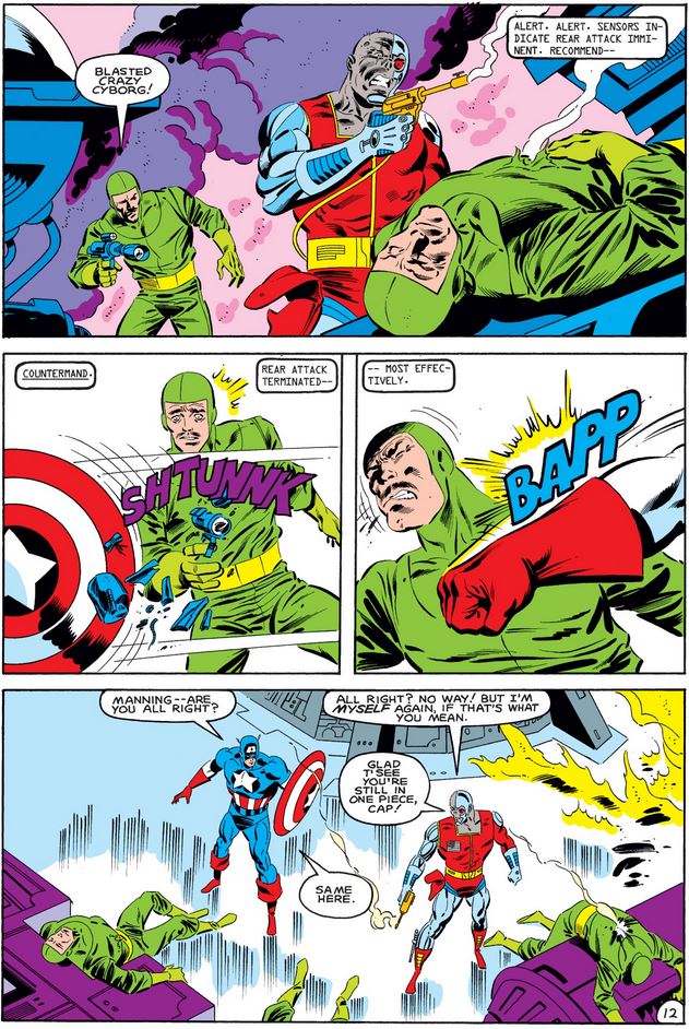 In the end, Deathlok reclaims the humanity within him, and after killing Hellinger, agrees to help rebuild their world. (For his part, Cap will return to 1983 in the next issue, albeit cover-dated January 1984.)