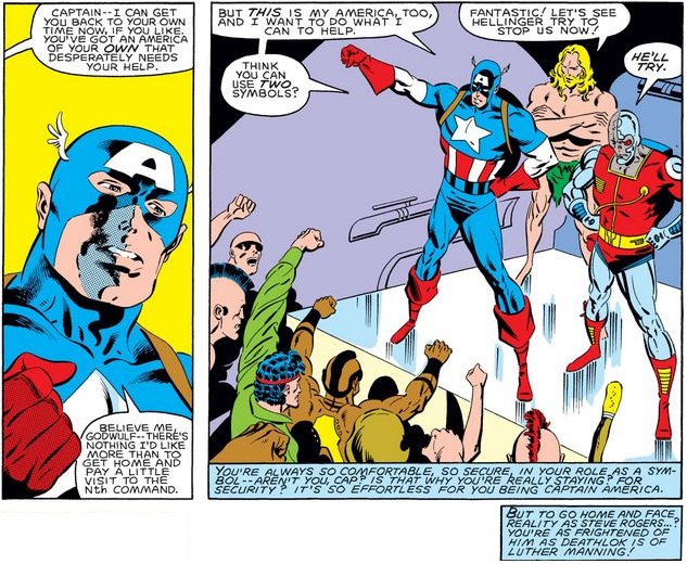 Godwulf offers to send Cap back to his own time, but Cap sees a fight where he is needed in 1991… and sees only Steve Rogers (and the Rosenthal family dinner) were he to return to 1983.