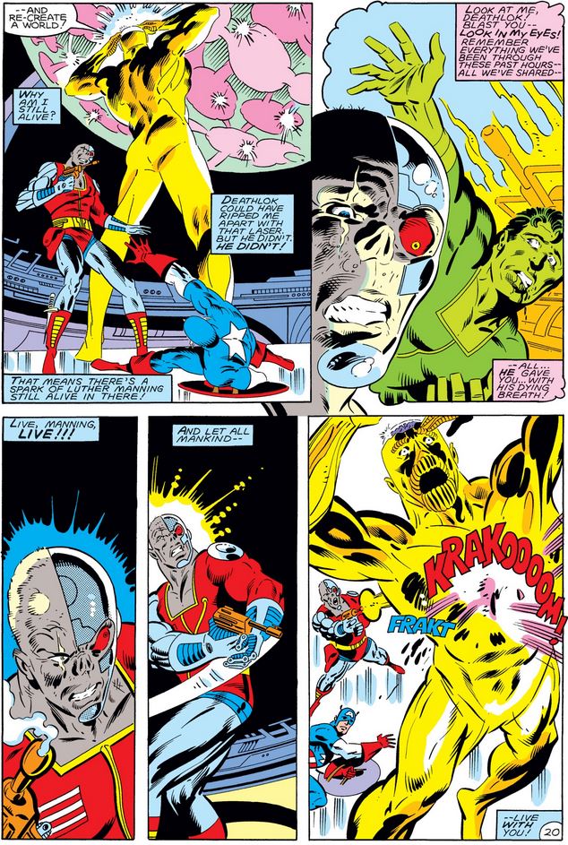 As they fight, once he realizes how the cloning process compromised Deathlok’s own mind, Cap uses psychological tactics again, like he did on Jack Monroe in the last issue, except this time, he’s trying to revive the man inside the machine.