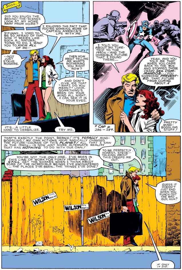 Next, we get a resolution to only the greatest cliffhanger ever in comics: What happened when Steve Rogers finally met Bernie’s parents, an event he was so keen to avoid he risked his life on an adventure to a dystopian future with Deathlok?