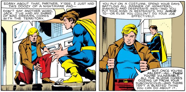 We can read Steve’s sympathetic comments as describing a sort of post-traumatic stress disorder (PTSD), which was added to the DSM only in 1980 (after being diagnosed in many Vietnam veterans), so kudos to writer J.M. DeMatteis for alluding to it here, adding yet other dimension of humanity to Captain America (and superheroes in general).