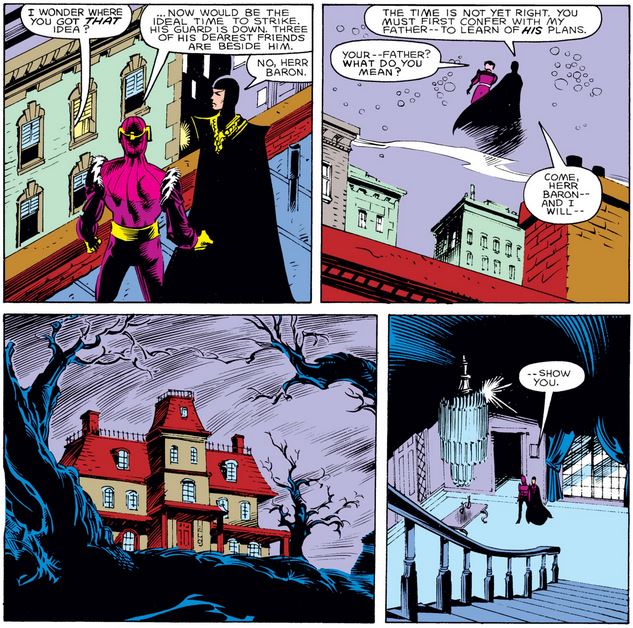…and which is overheard by the evil pair who had visited Arnie earlier. We recognize Baron Zemo the younger, of course, last seen in issue #278, and his companion is Mother Superior (not Mother Night, as the cover would suggest), who claims a rather infamous lineage.