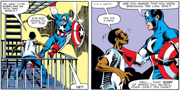 Rather than point out the young man’s double negative, Cap focuses on reconnecting with his former partner, who seems reconciled to the election results (although “loser” is a bit harsh). Similar to Cap, Sam has experienced his own revelation about his dual identity, coming to appreciate his value as a social worker as well as a superhero.