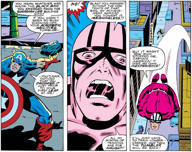 This fill-in issue follows up on two previous stories, way back in Tales of Suspense #83 and Captain America #169, all wrapped up in a cover by John Byrne, which seems like an homage to Jack Kirby’s cover to Tales of Suspense #76, albeit with the Tumbler—or a Tumbler—in place of his conceptual cousin, Batroc the Leaper.