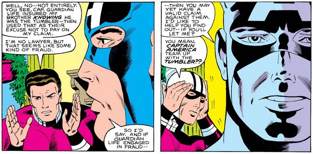You might think that would be our story… but there’s more! When Cap looks in the bag, he finds a life insurance policy written out to the original Tumbler, John Michael Keane, and in the subsequent exposition, the new Tumbler reveals he is the original’s brother, Michael. When the insurance company refused to pay out on his brother’s policy because he died while engaging in criminal activity, Michael couldn’t support his mother or pay her medical bills, after which she died and he sought revenge on the insurance company.