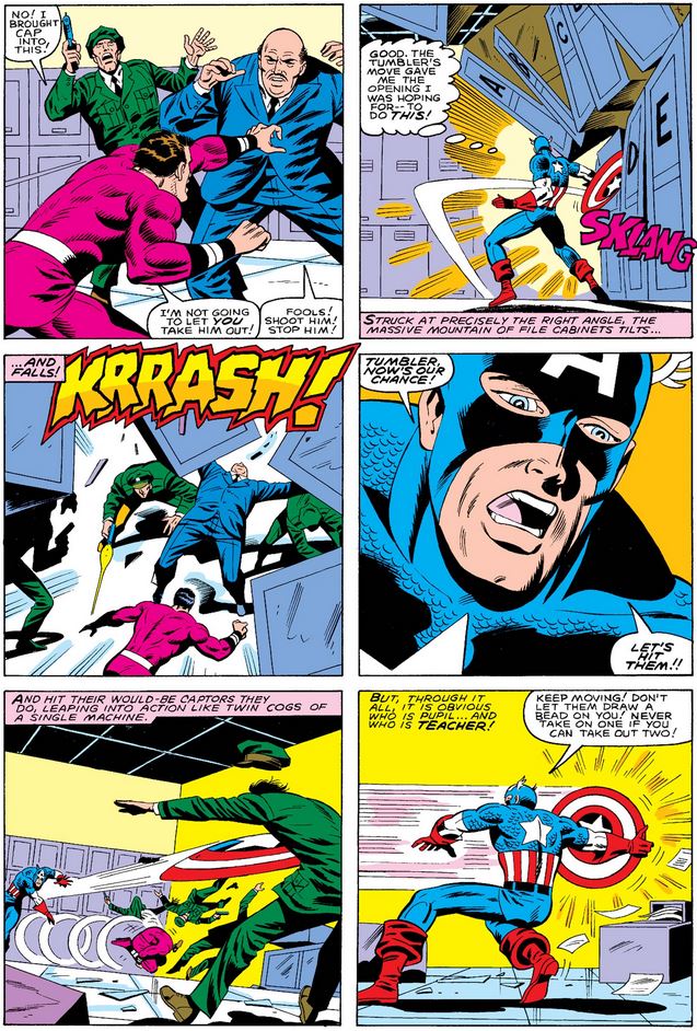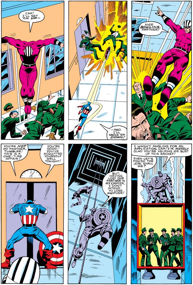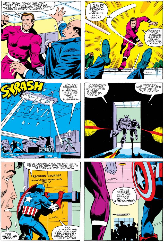We begin with our hero discovering our villain in the midst of villainy, after which they assure each other they know their names before launching into a great fight, modeled on the great battle scenes between Cap and either the Tumbler or Batroc in the days of olde.