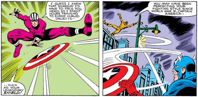 We begin with our hero discovering our villain in the midst of villainy, after which they assure each other they know their names before launching into a great fight, modeled on the great battle scenes between Cap and either the Tumbler or Batroc in the days of olde.