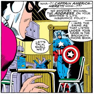 After they break in, a quick look at the files reveals that the company insures a lot of costumed criminals, policies on which the survivors are hesitant to file claims lest their identities be revealed… but Michael did. When Matthews, the company employee who denied the claim on the original Tumbler’s policy, threatens to kill Cap and Michael in the middle of a “burglary attempt,” Michael stands up for Cap, giving him a chance to get the drop on them.