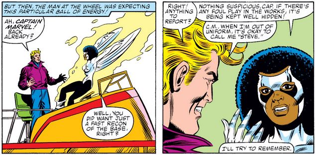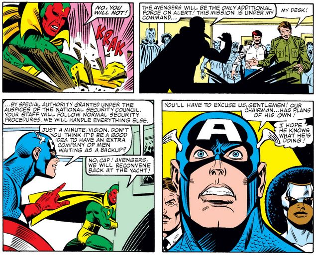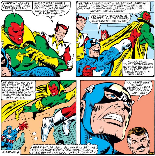 In issue #245, Captain Marvel flies up to the rocket, checks on the Wasp and confronts Cather, then radios down to Earth to confirm the danger. Vision takes charge, and when Cap questions his orders, Vision convinces him of their wisdom, but leaves him skeptical and suspicious nonetheless.