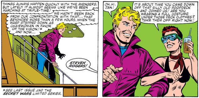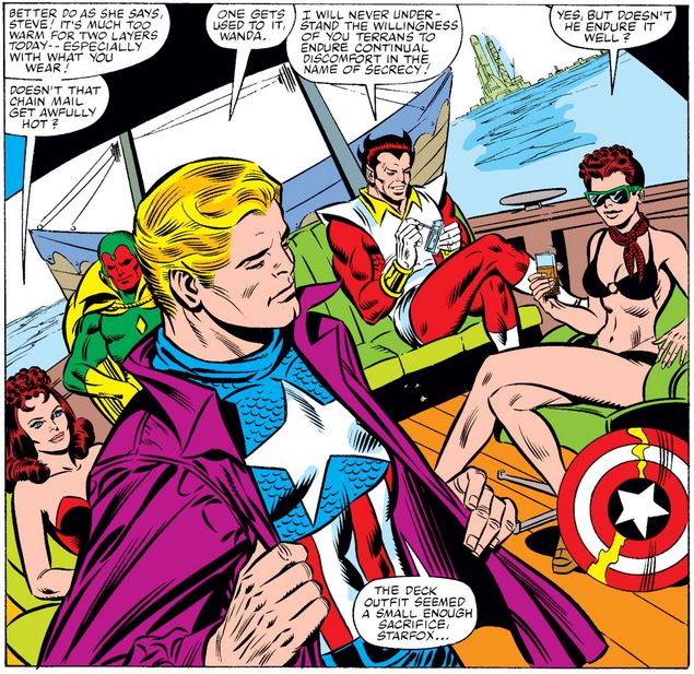…where it seems only the women on the team are in swimwear (what a surprise). For his part, Cap does disrobe a little, but just ends up having to explain his state of overdress.