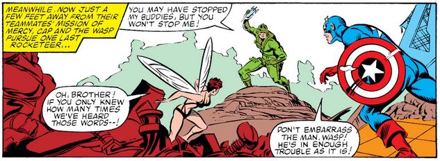 Turns out he wasn’t as “out of uniform” as he claimed to Captain Marvel above… and good thing, because the Avengers are called to action when space center is attached by a quartet of “rocketeers.” After defeating three of them, some of our heroes attend to rescuing service personnel while Cap and the Wasp toy with the last one.