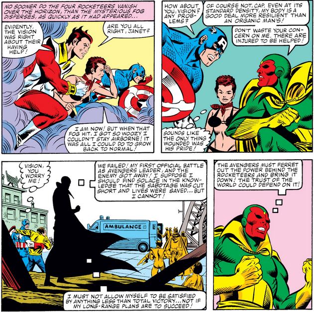 But the villains soon escape under the cover of a mind-numbing fog that affects even the Vision, despite his protestations to the contrary, and his defensiveness is noted by both Cap and the Wasp.