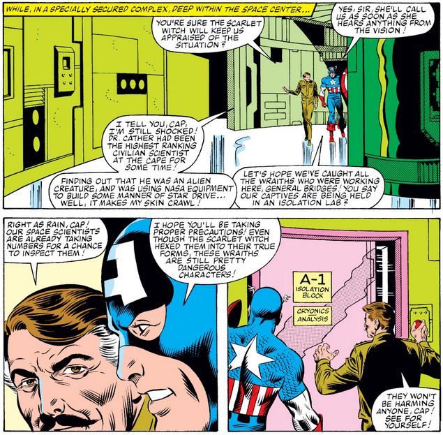 Later, the Avengers meet with General Bridges, head of military security in charge of guarding the space shuttle, and Dr. Cather, who is conducting scientific experiments there, including his own ion rocket, and everybody shares what they know about the variants of Skrulls known as dire wraiths. Bridges and Cather disagree about what deserves greater protection, the space shuttle or Cather’s rocket, but Bridges pulls rank and devotes his personnel to help the Avengers guard the shuttle… which greatly upsets the Vision, triggering Cap’s concern once again.