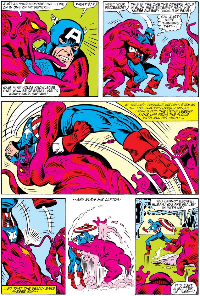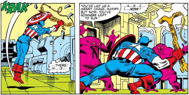 These two issues contain a fairly standard alien invasion story—just look at the cover to the right—one that, in terms of Captain America, serves mainly to show his growing concern over the Vision’s odd behavior (which only gets worse, as we will see when Cap next appear in this title in issue #251).