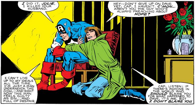 Of course, this only repeats the pattern of people close to him being in danger from his enemies, so Cap takes responsibility for what happened, even though he had nothing to do with it, because Mother Superior and Baron Zemo were using Dave to get to him.