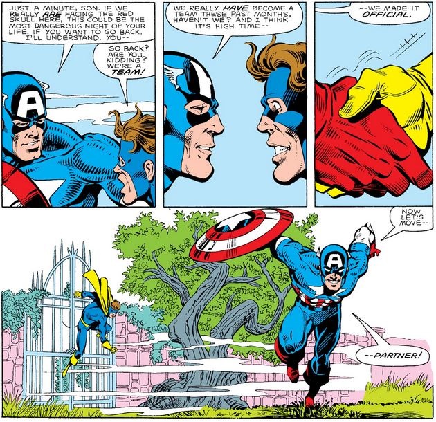 Arnie turns out to be a robot that falls apart and melts, but not before leaving a message for Cap, inviting him to confront the Red Skull and his two partners in villainy. On the way there, Cap and Nomad take a moment to make their partnership official. (“Now Jack, before we can fight the Red Skull you’ll need to go to HR and fill out some paperwork…”)