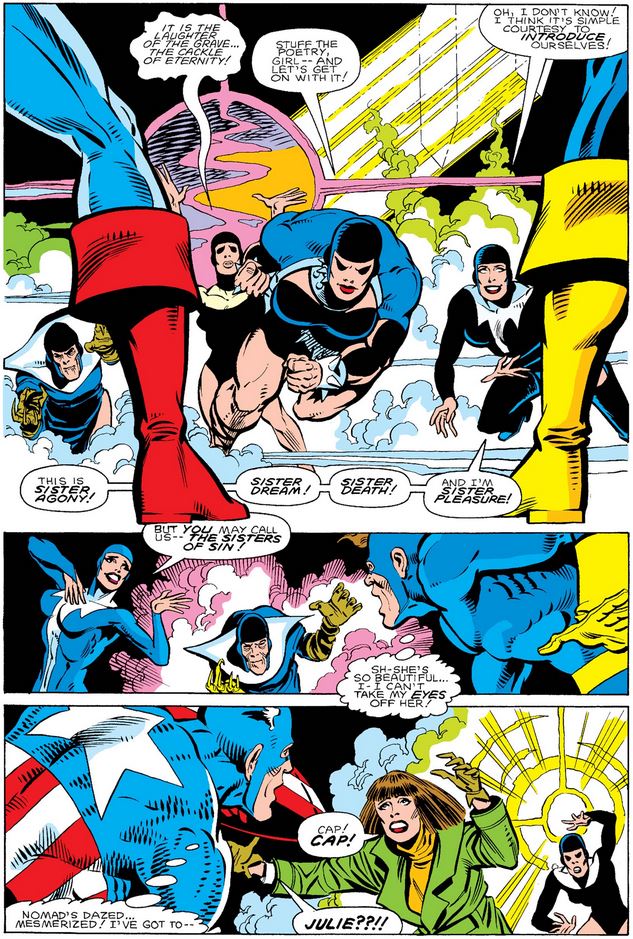 This issue continues the ongoing plot of the Red Skull, Mother Superior (his daughter), and Baron Zemo—as well as their new compartriots, the Sisters of Sin, seen on the cover to the right—against Captain America and his amazing friends. Their techniques take a distinctly psychological turn, building on what they did to Dave Cox in issue #293 and the bust of the Skull they sent to Bernie’s apartment in the last issue.