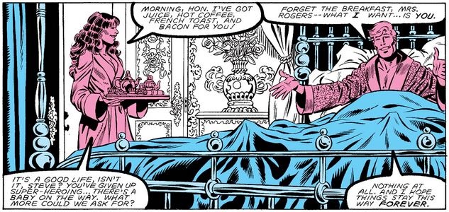 It’s interesting that Cap would dream of this: Retiring from active duty makes sense in terms of his new engagement and his fears about keeping Bernie safe, but we know from stories past (most recently the Deathlok tale in issues #286-288) that he doesn’t feel complete without both aspects of his identity. Then again, at this moment, and given his sudden older appearance, retirement probably looks good!