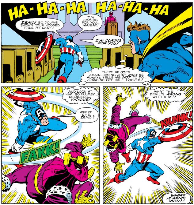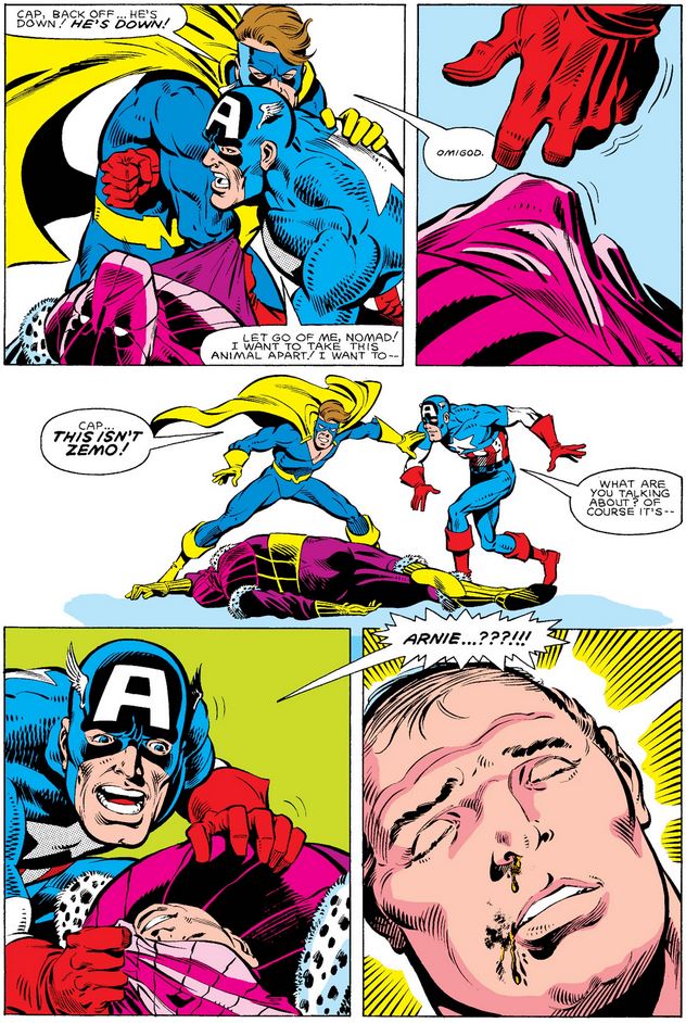 …whom Cap easily defeats, but keeps wailing of him nonetheless, only to be stopped by Nomad before discovering it wasn’t Zemo at all.