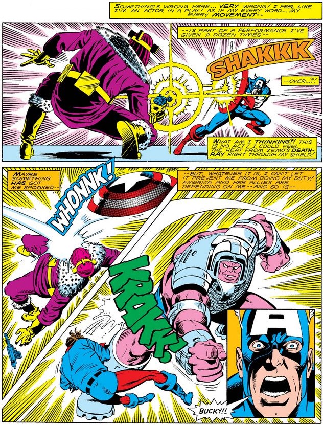 1. I never saw this issue as presenting the Red Skull as honorable. He’s totally driven by delusional self-interest. All the stuff the Skull rambles about here, and in the next couple of issues, feed into his Inferiority Superiority Complex. The Skull is trying to present himself as this horrifying force of nature, and his longtime struggle with Captain America as an epic conflict between two gods. Even if he is unable to admit it to himself, the Skull is just deceiving himself, denying that in reality he’s just a sad, petty, pathetic excuse for a human being.