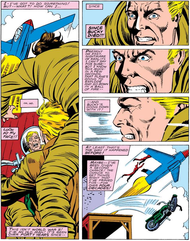 At a crucial moment, Cap remembers what is about to happen, while he becomes aware of his recent aged appearance (as of the last issue), contributing to the perplexity of his current situation and also giving him hope that, this time, things may turn out differently.