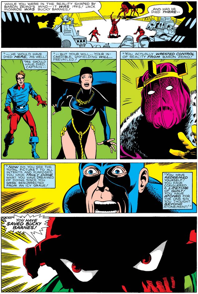 At the same time that he reaffirms his burning hatred for Cap—in very personal terms, without a hint of his usual political goal of destroying the living symbol of American democracy—the Red Skull admits the esteem in which he holds him, and proclaims that his success in Zemo’s dreamworld (or whatever it was) will only make killing him all the more satisfying.
