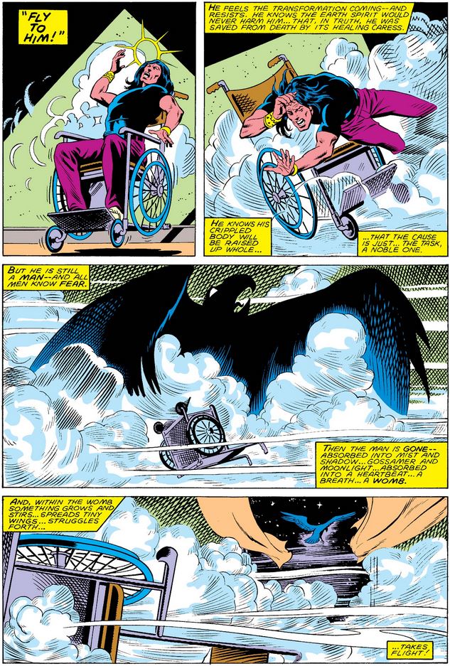 Because the text may be too small to read, here is the verbal part of the Earth Spirit’s message to Black Crow, reiterating his relationship to Captain America and summoning him to his brother’s aid.