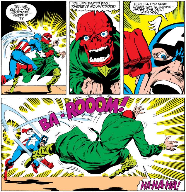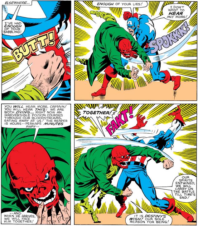 Speaking of whom, the Skull reminds Cap of their impending death by poison as they continue to pummel each other (to the sounds of SPOKKK, FAKT, and BUTT, which is still not a sound effect).