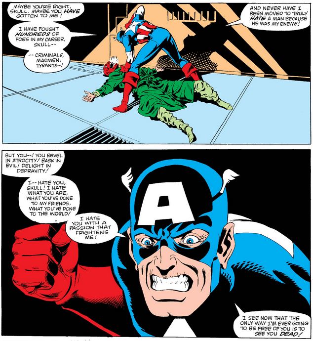 …which Cap concedes, succumbing to the base hatred that he has resisted for so long and even acknowledging that he will kill this man who lies beneath him.