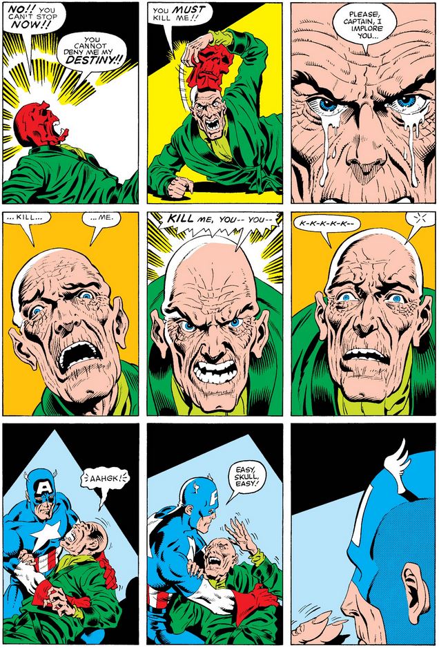 The Skull continues to monologue about his plans, and Cap eventually has enough, making clear to his arch enemy that yes, he fights, but he fights to live…