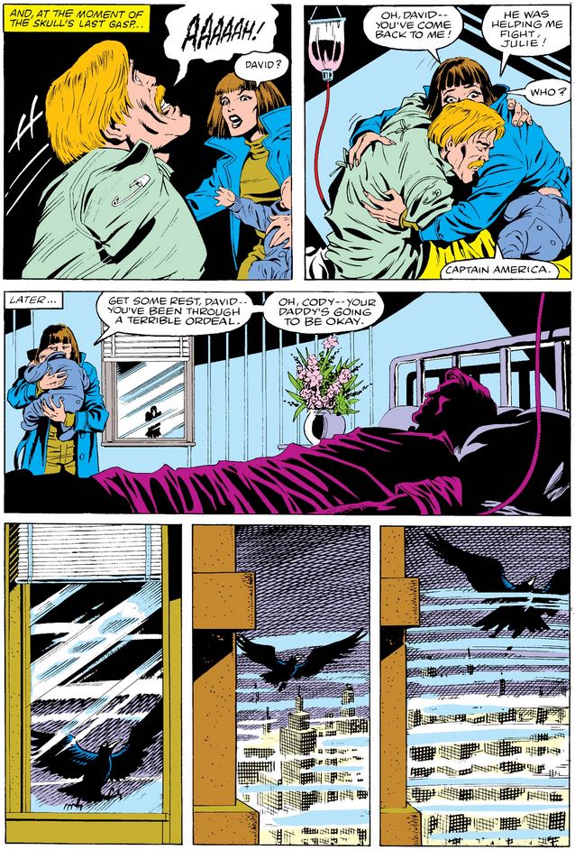 This is the end of the Red Skull—at least for a while—but it is a new beginning for Dave Cox, thanks to Captain America. (Or maybe it is the black crow outside his window? Who knows?)