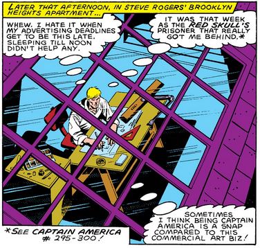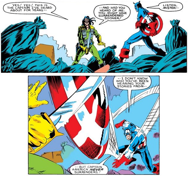 That issue ends with Batroc gloating over having the shield at last, but it isn’t until Captain America #303 that we learn why he wanted it. (Hint: Cha-ching.) But before we get there, Cap is less defiant and more despondent about losing his best friend, while having to continue consoling Nomad at the same time.