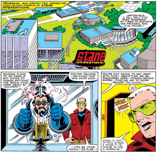 The scientist above is Dr. Myron MacLain (not MacLean), introduced in Avengers #66 as the inventor of adamantium, the metal wot makes Wolverine’s claws so shiny. Now what do you think he’s trying so hard to duplicate?