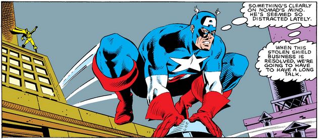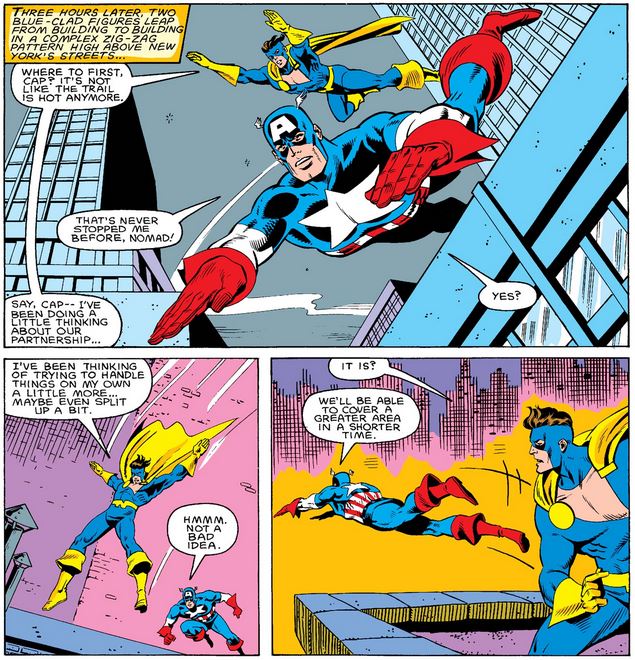 Soon, Cap and Nomad head out in search of the shield, and Nomad tries to broach the topic of going out as a solo act. (No, they did not suddenly acquire the power of flight, although you cannot be blamed for thinking they did.)