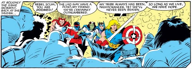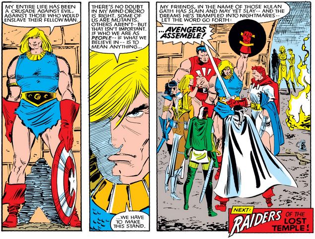 These three issues of Captain America, written by Mike Carlin, are part of the short transition between the legendary runs of J.M. DeMatteis, which ended with issue #300, and Mark Gruenwald, which starts with issue #307 (and lasts, with the exception of one issue, to #443!). Although we won’t see him much here, this story does feature the return of Batroc, the gradual departure of Nomad from the book, and finally the secret of Captain America’s shield (although, as we will see, it was actually revealed slightly earlier). Afterward, we get a brief appearance in a fantasy-themed two-parter from Uncanny X-Men that still shows Cap being Cap, no matter what he wears.