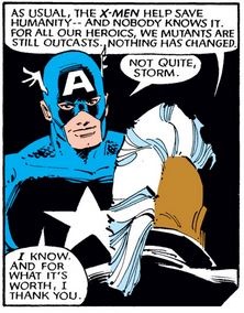 The story wraps up in Uncanny X-Men #191, and when everything has returned to normal, Storm makes a point familiar to X-Men fans, one which Cap himself echoed recently in Avengers #252 when anti-mutant bigots burned down the house belonging to the Scarlet Witch and Vision.