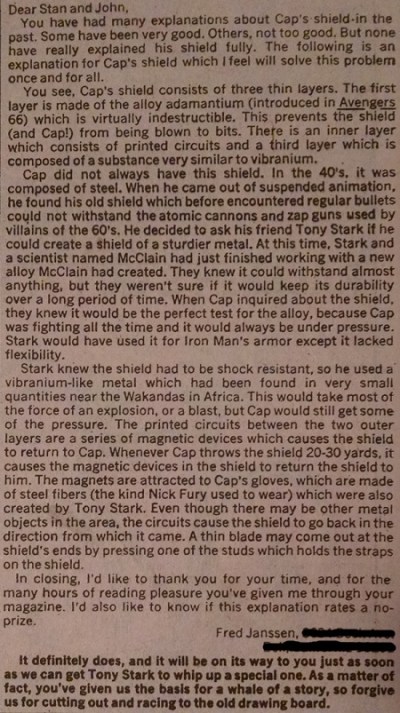 Even more curious, the composition of the shield was suggested over a decade prior, by a reader named Fred Jansson in a letter printed way back in Captain America #145 (January 1972):