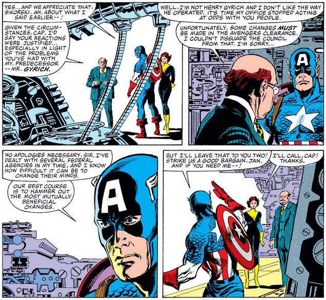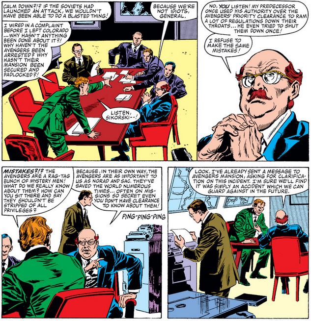 As I mentioned at the end of the last post, the United States government is none too happy that the Vision took command of all their computer systems when he had “world domination mode” switched one. In issue #255, we see the Avengers’ current National Security Council liaison, Raymond Sikorski, defend the team against his fellow G-men, using much the same arguments the team themselves used against his predecessor Henry Gyrich in front of the Senate in issue #190.