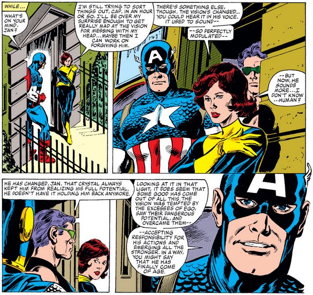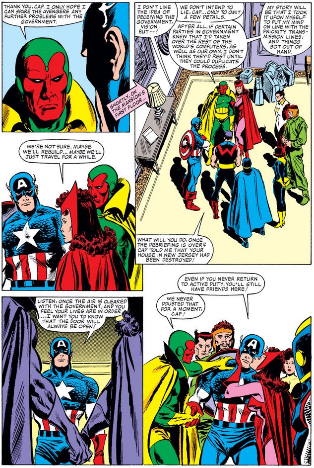 Just as Cap consoled the Vision for his failures in issue #255, his teammates do the same for him here, which seems to make him feel… a little better, I guess?