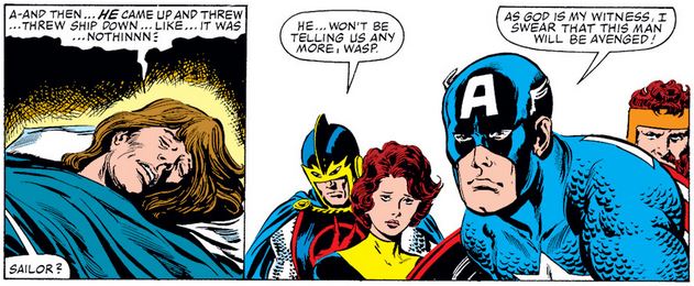 …which one of the sailors describes as an attack from a huge being before he succumbs to his injuries, inspiring a solemn pledge from Captain America that invokes the name of the team (and raises the perennial question of whether the name actually fits its mission).